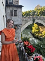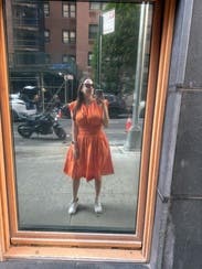 It’s no coincidence I rented this for the week Taylor Swift released her new orange dripping album cover! I’d get this dress in every color way because it hit me in all the perfect places. My waist? Missing in action. My chest? Accentuated. The arms? Delicate details. The fabric is lighter and flows. I wore this casually in the city with sneakers (pictured) and with flats for a dinner in the evening!