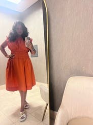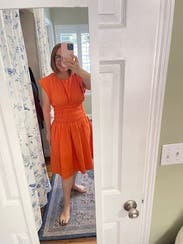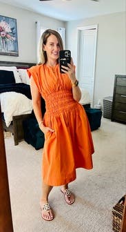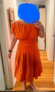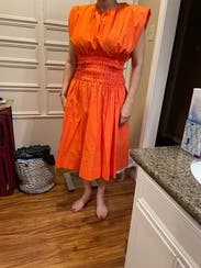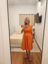 I wore this dress several times. It’s really cute and makes a statement. You can’t miss an orange dress!!! Fits true to size. I loved the elastic around the waist.