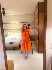 The orange is so vibrant and this dress is a dream on larger bust / hourglass shape. Great length for taller girls