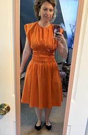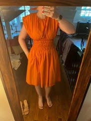 Orange is one of my favorite colors, and I was so excited that the dress was even better in person than I was hoping! The details are perfection- from the slightly exaggerated shoulders to the ruched waist and tie at the neck. And pockets! It is a heavier cotton that needed to be ironed to look its best. I decided to style it with sandals, but for sure would wear it with heels or sneakers- and still may if I keep it for a while! It would work for a variety of body types. Small item of note is that the armholes are a little big/low. If I had sized to an XS, that may not have been an issue.