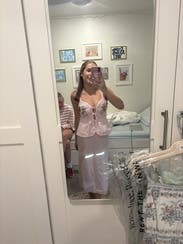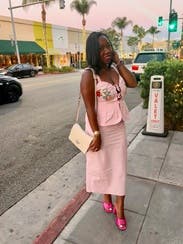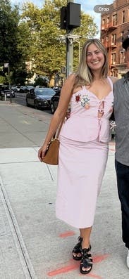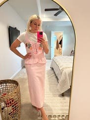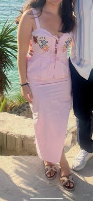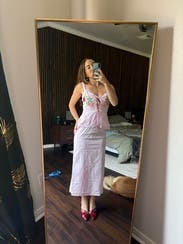 A lovely pink dress. I loved the flower detail and the tying on top. Some things to consider: It was tight around the butt and legs in a flattering way, but it made it hard to sit on the floor. The dress also wrinkles easily on the bottom.