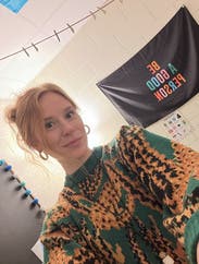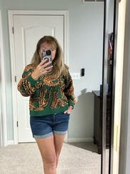 This was the best picture I had of the sweater, trying this hat on in a store. Wore for my son's college parents weekend. Wore it all day and night- it worked so well, and was his school colors! Will probably rent again.