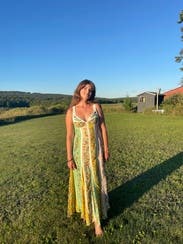 Such a pretty dress! I received lots of compliments. The dress was very comfy and fits true to size. It has a nice fabric and it was great for a summer wedding. I will say if you’re a bit bustier though it probably won’t fit you on top.