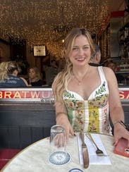I wore this for derby party and got a ton of compliments. It’s a bit low cut depending on your comfort level. It felt very high quality, incredible stitching. Colors are beautiful!