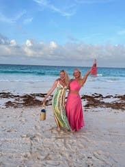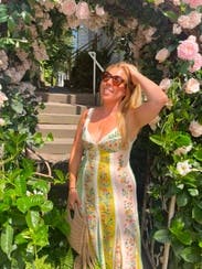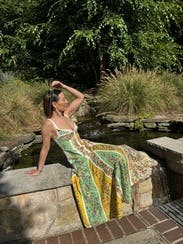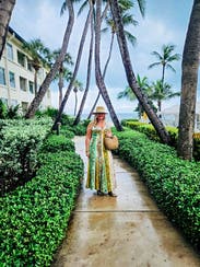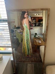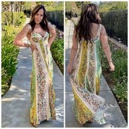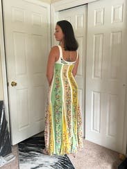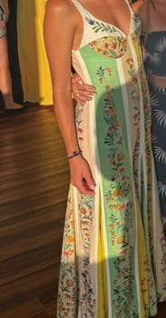 Wearing this is an experience beyond just a dress. The panels are tapered to highlight your waist as well as swirl around your body as you walk. I originally rented a medium as I thought I’d need the room in the bust, but it was too big so I rented a small the 2nd time around. The fit was perfect this time. I really appreciate the rubber strips placed on the inside of the straps to keep them from slipping off your shoulders. Good length for petites as I only needed a 2” heel to keep it from touching the ground. The medium weight fabric helps keep it from wrinkling so I was able to wear it right out of the suitcase without ironing. Perfect for dinner at the beach or a tropical vacation.