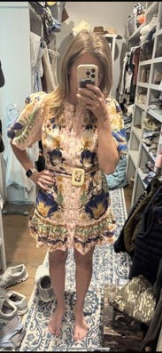 This dress is not my typical style but was fun for a rental. I'm only about 5'5" and it was pretty short on me -- wore similar-colored bike shorts under and wore flats. Material was light and airy, the dress was loose/kind of shapeless without the belt, but the belt was a struggle for me. It was HEAVY and dragged down. I'm kind of apple shaped and none of the belt holes would work for me -- it was too tight on the loosest belt hole which ruined the silhouette of the dress. So I skipped using any of the belt holes and just sort of tied it in a knot which worked. Cute for a one-night event and a perfect example of why I love renting instead of buying! This one is going back in my next swap :)