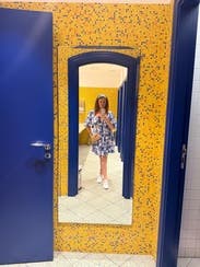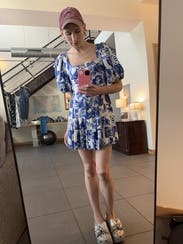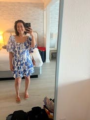 Wore this on vacation and felt so cute in it! The material is really nice! I'm 5'9" and it wasn't too short which never happens. The puff sleeves and blue print give it such a fun summery vibe. Honestly obsessed and would totally wear it again. PS I sized down to XS and fit fine!