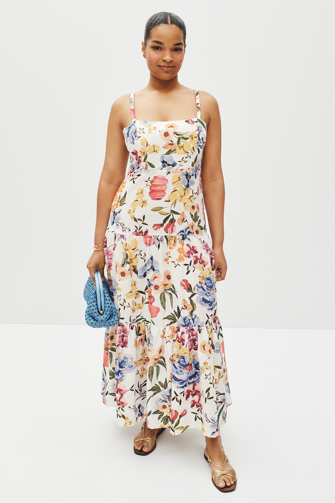 Off-white floral (55% Falx, 45% Viscose). Casual dress. Square neck. Sleeveless. Pull on. Shoulder to hemline: 51". Imported.