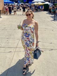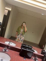 Worn to a food festival. I rented both the L and XL in this dress. The L was too tight on my 11-week baby bump, and the XL was much too large on the chest and under the armpits, plus I couldn’t tighten the straps further because of the fun bead elements on the straps. I ended up using fashion tape to hold the straps down because I still wanted to wear this beautiful dress! Picture is of me in the XL, 13 weeks pregnant. This dress is better for folks with a less curvy body type.
