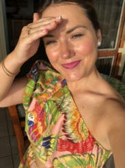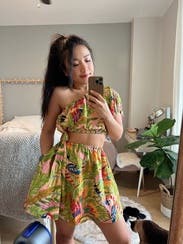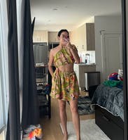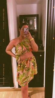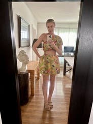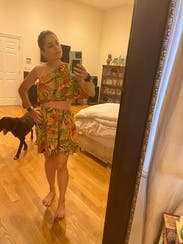 I wore this for my birthday party on a boat. I got a ton of compliments, I loved the cut and the pattern. It was very short, so I wore mini bike shorts underneath. And it's pretty tight around your stomach—I felt a little self-conscious after eating pizza, because it's not forgiving at all. But overall, fun vibes!
