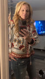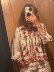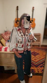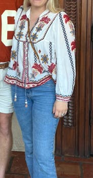 Exceptional Farm Rio blouse that became my rock n roll got to top. Wore to two different concerts and received many compliments. The embroidery is fantastic, particular the cut work on the back. The tie strings are definitely a bit long, but the beading makes it tolerable.