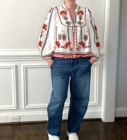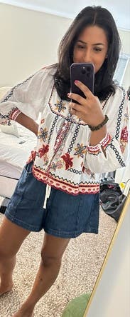 I absolutely loved this unique set. The delicate embroidery and beaded tassels add such a charming touch. The top is slightly sheer but still beautiful, while the bottoms are made from a thicker cotton that gives structure and comfort. It’s so fun to wear as a set, and both pieces pair perfectly with denim or white for a fresh, versatile look.