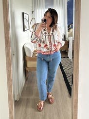 Wore to work with jeans and white pants. Loved this top but I’m a sucker for Farm Rio. The beaded tassels were so fun!