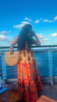 Got lots of compliments on this. The pattern with the birds and flowers is very tropical feeling. The overall quality of the dress was a huge hugh point for me and felt good to wear on a cold cruise ship.
