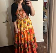 Wore this dress on vacation and my sisters went nuts over it. The colors are so pretty, the dress is on the heavy side, but it’s made awesome. I had to have it, so I bought it.