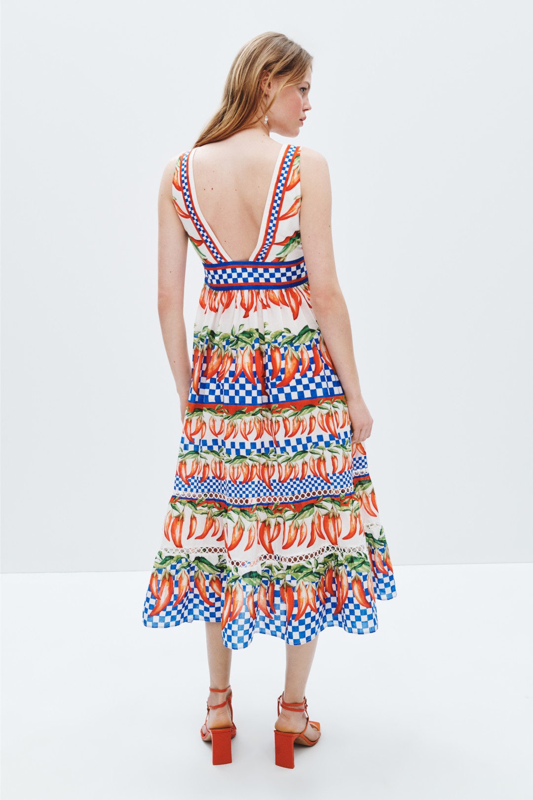 The FARM Rio Picnic Peppers Ainika Midi Dress turns heads with a playful print and bold color blocking. Pair it with block heel sandals and a straw tote for a breezy daytime look.