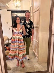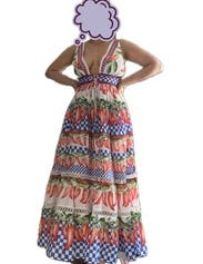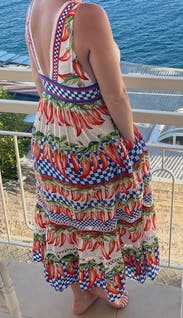 This dress did not disappoint. I wore it for my birthday and didn't want to take it off. The colors and peppers were so cute and I got so many compliments. It's long, comfortable, and has a couple layers so it's perfect for a chillier summer night. My chest fit perfectly and then it had two ties in the middle that helped to create the perfect cleavage. I would rent this dress again and again