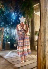 This dress was so fun to wear! The front and sides are very low cut (tried to show in the photos), but I don’t have a chest, so that wasn’t a problem for me. I could see how this might cause an issue for larger chested girls, though. The fabric is light and airy and was perfect for a summer vacation. The print is really fun and I got multiple compliments on it! Only caveat- the band around the waist is at the bottom of the ribcage is tight! There is no give. If you have a wider ribcage or midsection, I’d recommend sizing up, because it was a tight fit. However, had I sized up, I don’t think the bust area would have fit properly. Good length maxi for girls on the shorter side (I could wear flats or wedges). Has pockets!