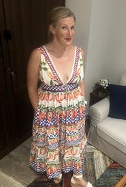Cute dress, very thin material. The dress is tight through the ribcage but helps keep everything in place. Perfect for southern Italy.