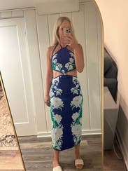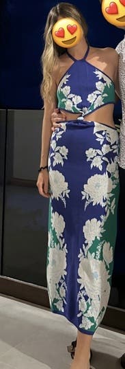 FarmRio does no wrong, except for the sizing on this dress. Size down!! I’m not sure if there is an XXS option, but I needed it. The dress didn’t look big, but because of the thicker fabric, I would have preferred a tighter look. The cutouts were amazing, I definitely felt summer sexy, and the bold blue is my favorite color because it makes my eyes pop. Will likely rent again for the right occasion!