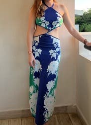 Blue floral viscose blend (68% Viscose, 32% Polyester). Hourglass. Sleeveless. Halter neck. Tie closure. 53.5" from shoulder to hemline. Imported.