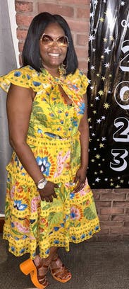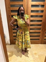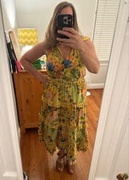 The dress was loose fitting and comfortable. The pattern was cute but the yellow wasn’t quite as bright as in the picture, had a little more of a mustard hue. I love the beading on the ties, it made the dress feel a little more unique.
