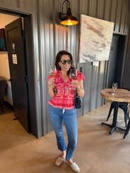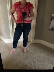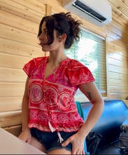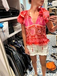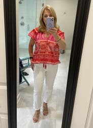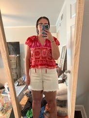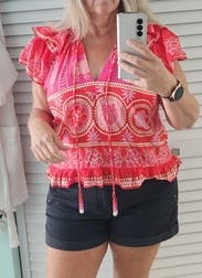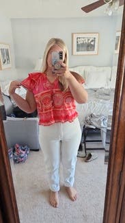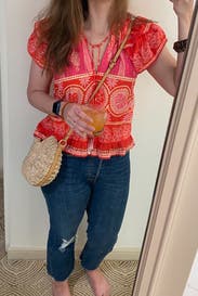 The shoulder ruffles and fun and flattering, and the beaded tassels add an elevated look. It’s definitely slightly cropped so I paired with higher waisted jeans and shorts, Loved this top!
