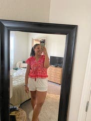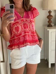 Loved this top! Perfect to wear with jeans or shorts. Got a lot of compliments. Small fit perfect.