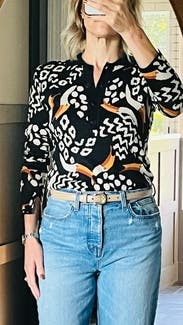 When I first saw this top, I was getting strong 70s vibes. It grew on me. I wore it on two separate occasions and it was very flattering with pants or a skirt. It is a little clingy, but comfortable. It’s probably better for cooler weather given the thickness of the material. It’s a very memorable shirt, so I didn’t purchase it. A future rental is possible.
