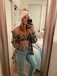 I rented the matching flannel with this and was so disappointed. I used two of my spots for this outfit. The matching shirt is an oversized box with no shape. You can't even see the bra top while wearing it.