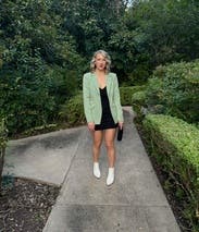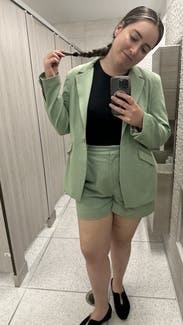 A beautiful well made jacket. The cinched in waist really gives this piece shape. It’s a classic mint color that really brought out my hazel eyes (gray, green, blue). The cut is on trend with spring fashion. There are so many fun ways you can style this jacket! I wore it with the matching shorts, gold accessories, and Mary Jane’s to church and work. It would look great with tapered stone washed jeans a lace bralette and pearl accessories or a white leather mini skirt and diamonds. I highly recommend this jacket for its fit, quality, and color.