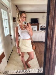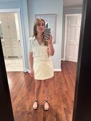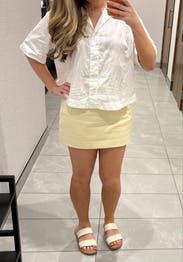 I loved this skirt but it ran big in the waist. I had to wear it with a t-shirt tucked in to fill it in. The butter yellow color is the moment