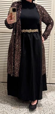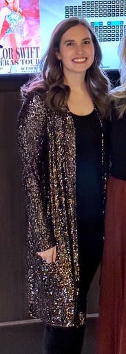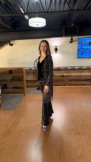I wore this to the Taylor Swift movie. It was the perfect amount of fun, yet comfortable. Description says brown, but it’s gold sequins and I wore with all black and it matched great. Will definitely rent again for a fun event!