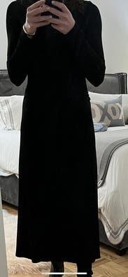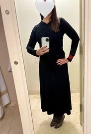 This dress was super-comfortable and I love the material - very soft. I wore boots with a 1" heel and the length was fine (without the heel I'd step on it going up stairs). The fit was a little off, however, in the shoulders/chest and around my waist. (I'm currently in-between sizes, so it's hard to figure out whether to go up or down.) The M would have been tighter but I wouldn't have had extra material bunched up. And the material is stretchy enough that the M probably would have been fine. The scarf hid the odd-fitting top but not the extra fabric around my waist. But the fitted blazer (that I would probably wear next time) hides both. Given the comfort of this dress, I will likely rent again, but will try the next size down (M).