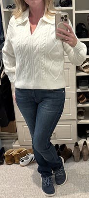 Fit tts. On the shorter and looser side. Very comfy, didn’t need a shirt underneath. The collar on this sweater gives it a bit of interest and makes it a bit more work friendly.