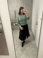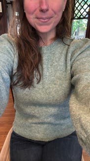 Comfy sweater and a lovely shade of green. Very soft. Great casual sweater although it is almost cropped in the torso. I wore a camisole under it.