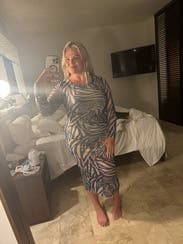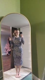 Still feeling the post partum mom weight but this dress was so great. Very easy and light weight. Fitted but not tight. Only issue was liner was SHORT so I think it’s a more night out look/ vacay dress than everyday. Wore this in Cartagena and was great in heat despite sleeves
