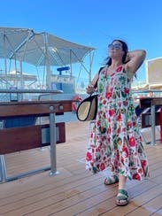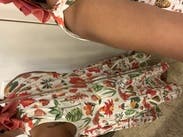 The unique pattern caught my eye and this is a show stopper piece I wore every day on vacation! I wore the button on the front undone and it was a really flattering v neckline, also perfect for breastfeeding! Cotton material was comfortable and durable for beach days and night out alike. Definitely will rent again.