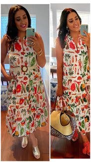 This dress is PERFECT. I packed it for a two week trip to Vietnam and it wore comfortably in the heat and humidity and didn’t wrinkle in my luggage. I wore it once for a wedding ceremony and then again later for sight seeing! So versatile! The colors are gorgeous and it’s so flattering. I wore it with sneakers and it still looked adorable. Love love love this dress.