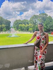 Wore this while 26 weeks pregnant. Pockets, flower garden print detail, button collar, and how light weight were what stood out to me. Would definitely rent again!