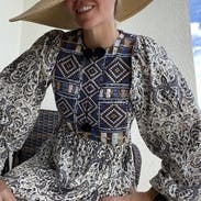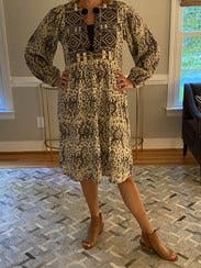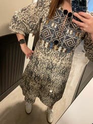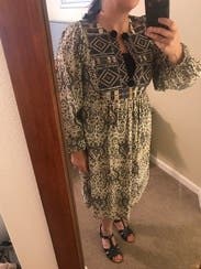 This was a nice transitional summer to fall dress as well as a good item for a beach vacation. The fabric and embroidery are lovely. I especially liked the voluminous sleeves, which could be worn down or pushed up to the elbow for a different look. It was slightly snug under the arms, but an in padded bra helped with that. Would definitely rent again.
