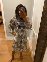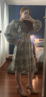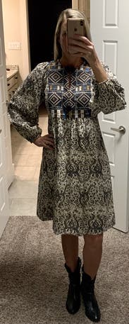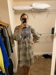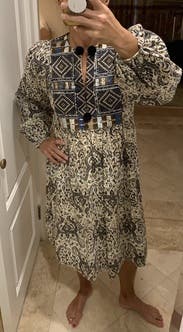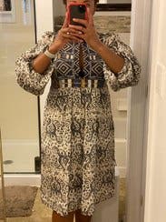 Not a flattering picture of the dress, but it was perfect! Lightweight, embroidery is beautiful, and it was not overly baggy or fitted. Wore this to a couple parties. It was a bit too casual for my work, but great for weekends!