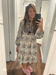 I thought this dress overall was very pretty. The detail at the top is stunning. It's easy to wear. But the sleeves are massive. I was going to take it on a trip but I can't get past the sleeves and my husband said it looked Victorian. Wore for a few zoom calls and around the house.