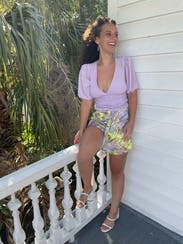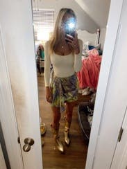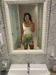 I felt so pretty in this skirt and received so many compliments! The colors are perfect for spring/summer! If you have any booty though consider sizing up because it will ride up!