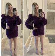 Get ready to rock the room with your sequins and giant sleeves and mini skirt! I tried this on in the store at the prompting of a stylist and loved it so much I held on to it for two weeks until I had a reason to wear it. It’s so fun and comfortable and over-the-top with the giant puffy shoulders, but it will flatter you everywhere thanks to the rouching. Fit is TTS. Love love love.