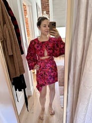 Loved this dress and received a lot of compliments. Wore to a rehearsal dinner for a wedding I was a bridesmaid in. The small was definitely snug and perfect fit, if anything it runs a little small. The cutouts I was a little concerned with being too revealing (maybe if you have larger chest it would be!) I didn’t use fashion tape but that could also help! Would rent again- the colors are so vibrant and silhouette is flattering
