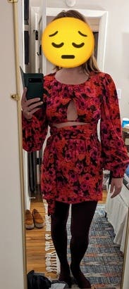 I didn't end up wearing this, unfortunately. The color and pattern are pretty, but the fit is insane. It's tight in the chest and then gaping above that. I used fashion tape to keep it from showing too much boob but still the fabric was billowy above (along the collar bone area). This part is super puffy and odd. Also, the shoulders are super puffy in comparison to the hips. For me this dress was very tight across the boobs, hips and butt. I felt it also made my hips look really straight and I felt off balance in it. I think this dress would probably work well on someone with a very straight shape, but if you much curve, beware! I'm nearly always a size 6 or s/m and a size L was really tight.