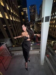 The top is so unique with the heart cutouts, but doesn’t feel over the top. The dress is black and slinky & truly goes with anything. I wore it out in denver so I wanted to dress it down with black cowboy booties & a simple purse. You could easily dress is up with heels and accessories. This one was hard to return !!
