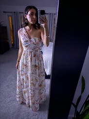 Fun and interesting dress for a garden wedding! I received a lot of compliments on this one, even though I don't think the photos did it much justice. The top was a little bit of a strange fit, hard to zip, but still a little big, but I tried it on with a bunch of different bra/undergarment combos until I got it to work. The length was fine with flat sandals (I'm 5'6"), and the pattern really was pretty.