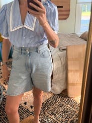 FRAME's Stripe Sailor Blouse in Oxford Blue Multi is a playful nod to nautical style, featuring a boxy fit, oversized collar, and pleated short sleeves. Pair it with high-waisted shorts and espadrilles for a breezy, spring-ready ensemble.